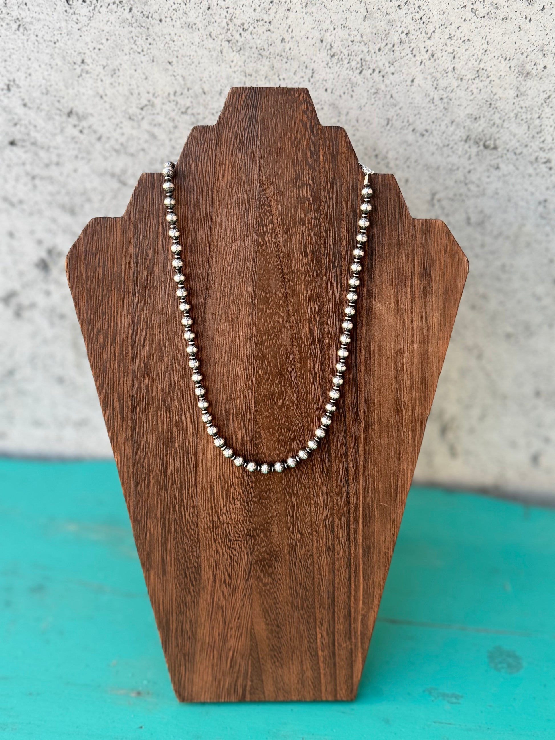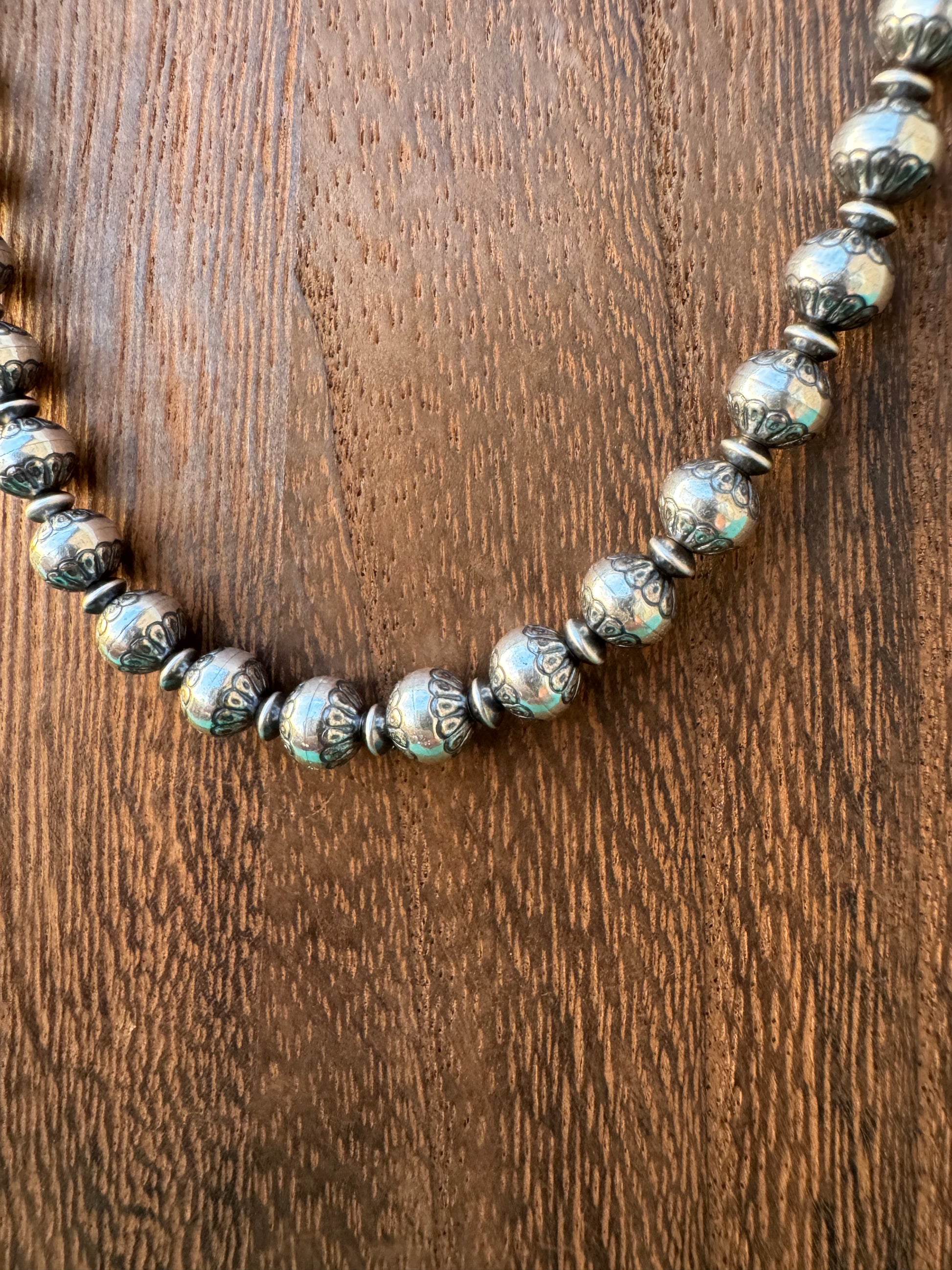 Fiona is a 18in flower stamped 6mm Navajo Pearl necklace.